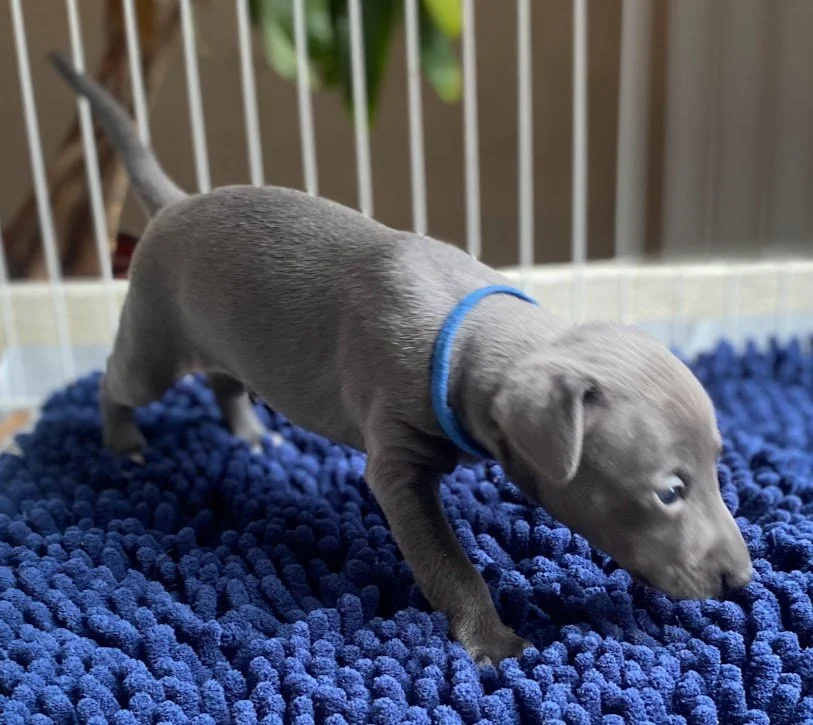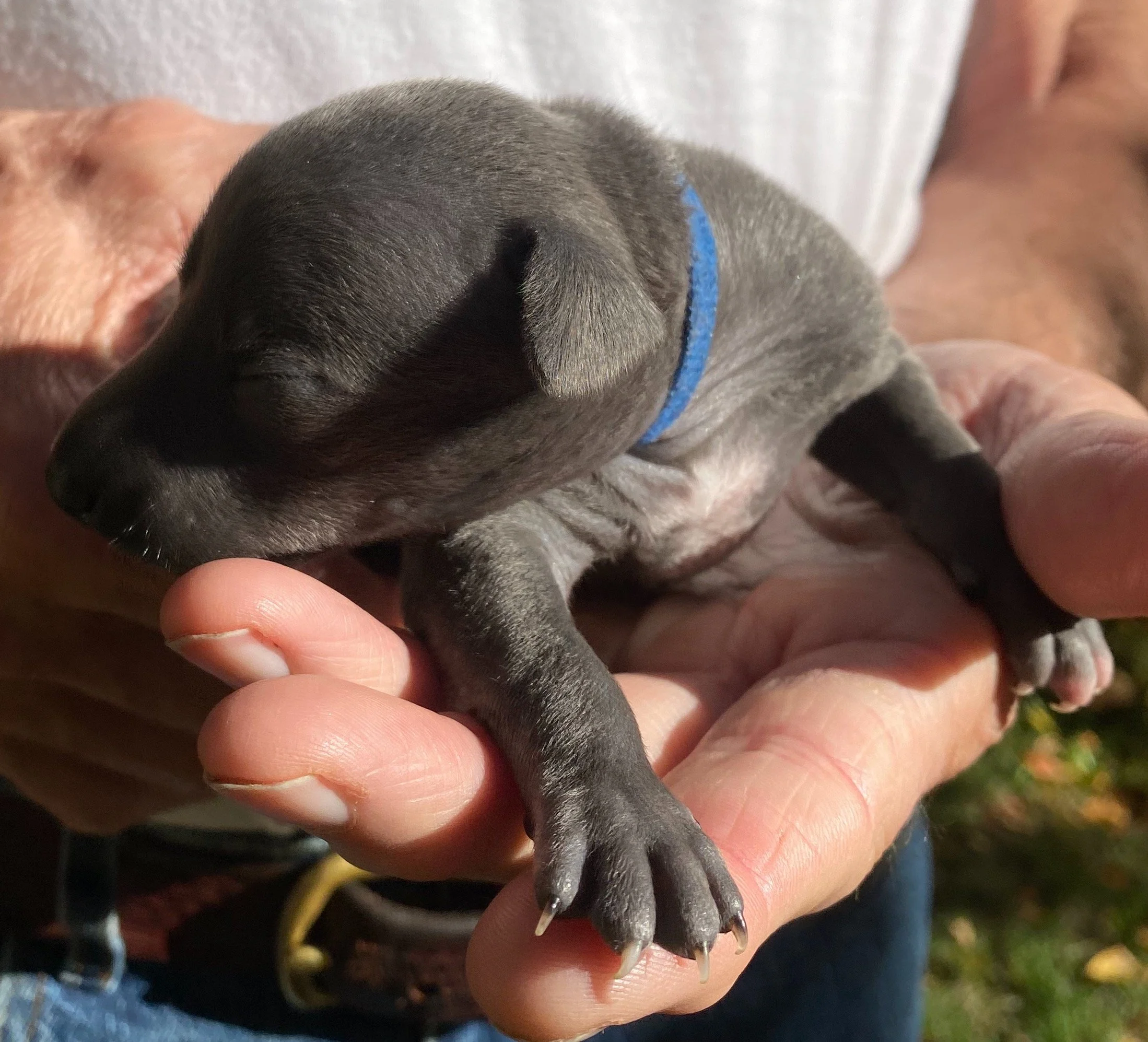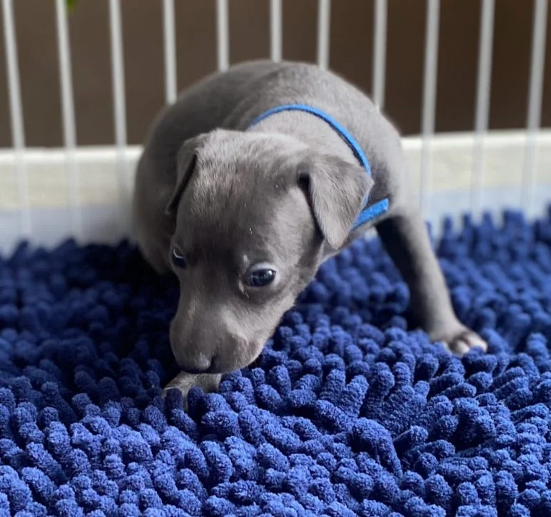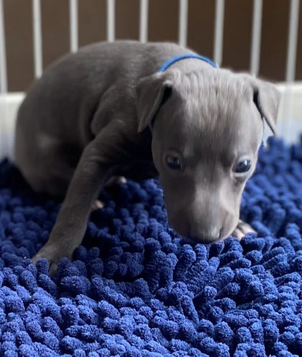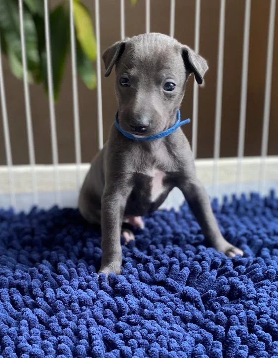 He’s a little blue Italian greyhound with a small white star on his chest.
