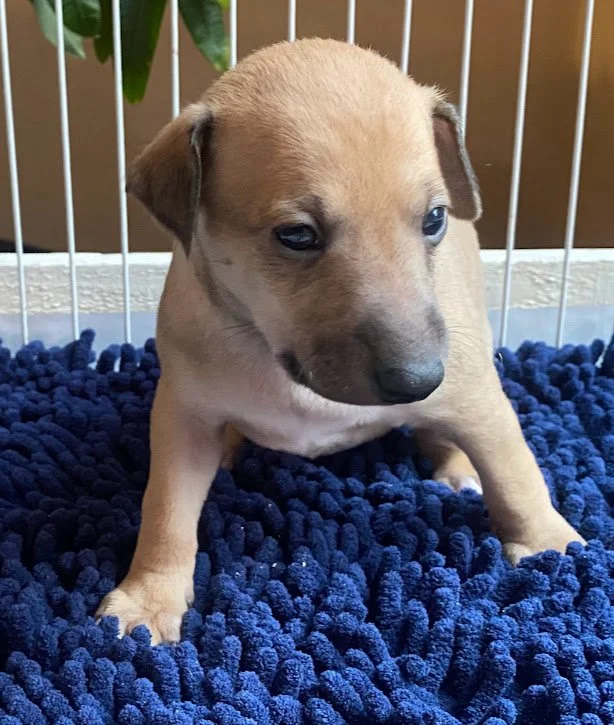Maldy is a red fawn Italian greyhound male, with a little white map on his chest.